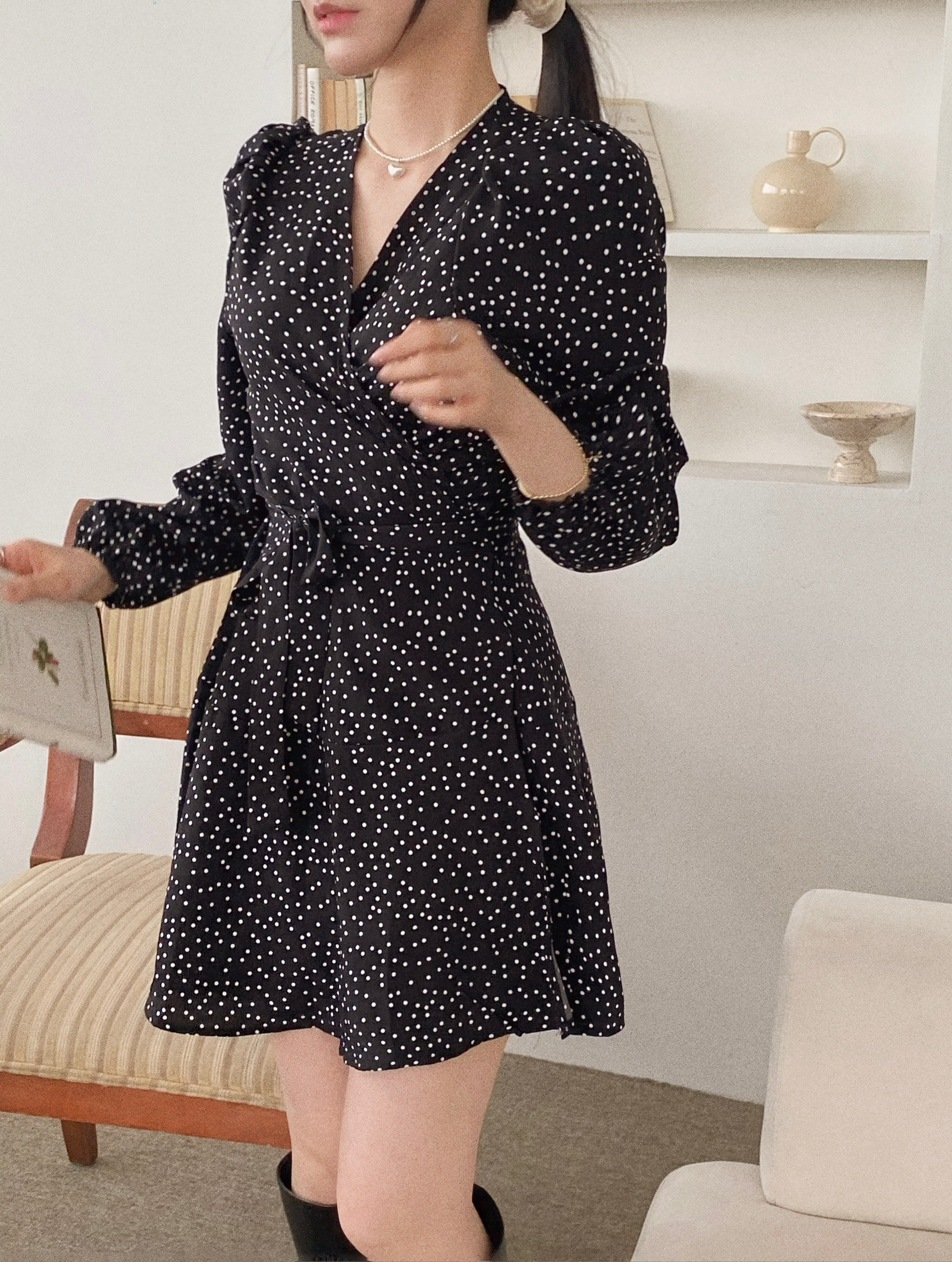 [청순/최저가]도트 땡땡이 랩 원피스 페미닌원피스/치마/여친룩/도트치마/랩원피스/하객룩/데이트룩/대학생룩/캠퍼스룩/오피스룩/프릴원피스/빅사이즈/랩치마/검정원피스/캐주얼원피스/휴가