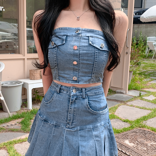 데님스모크탑 blouse + 플레어스커트 (투피스set)