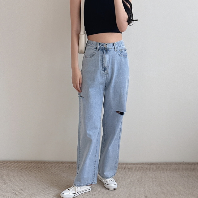 여자 허리밴딩 트임 찢청 와이드 데님 팬츠
