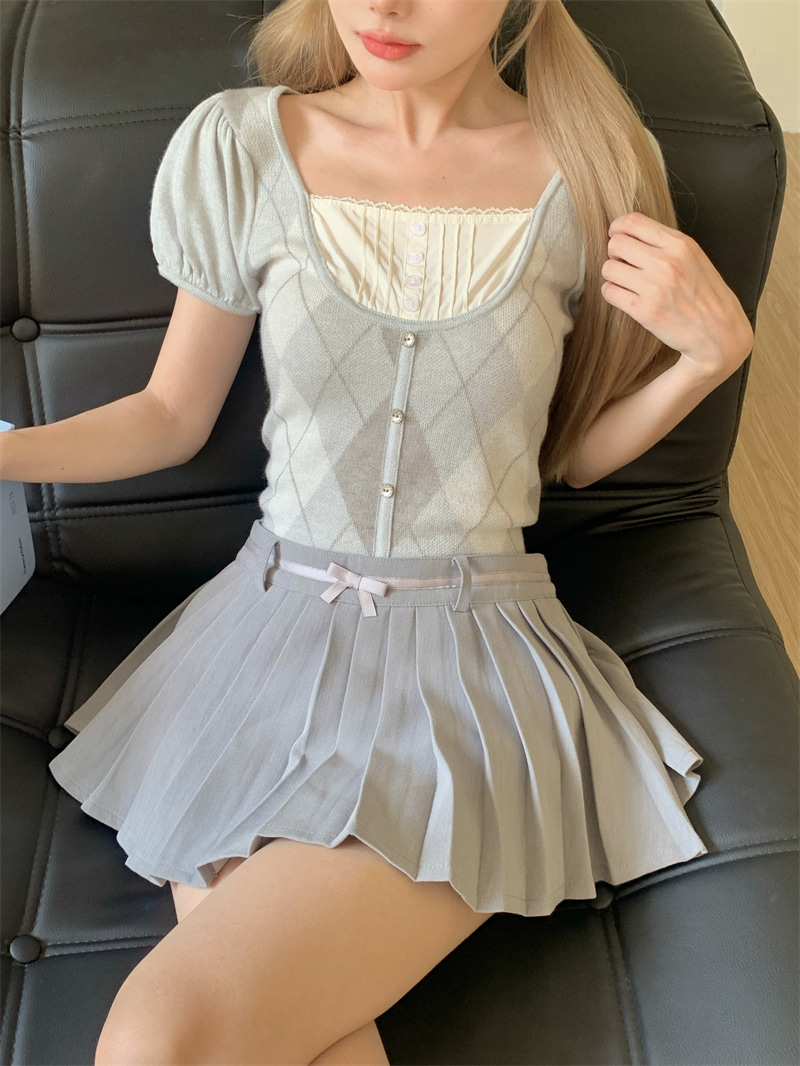공항패션 공항룩 [그레이/블랙] 아가일 체크 유넥 반팔 니트 티셔츠 / 플리츠 미니 스커트