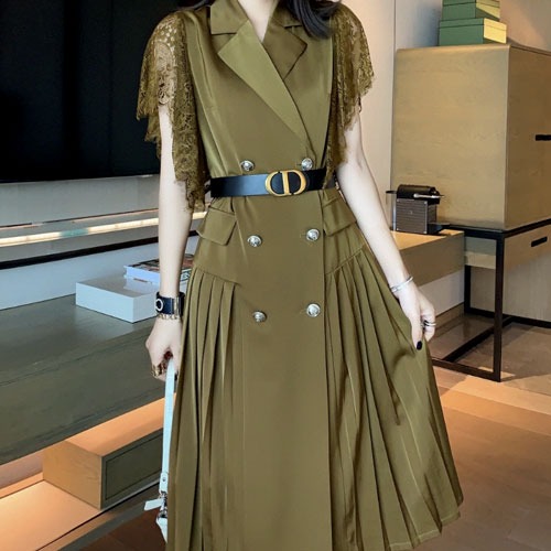 날개 레이스 소매 카라 플리츠 미디 원피스