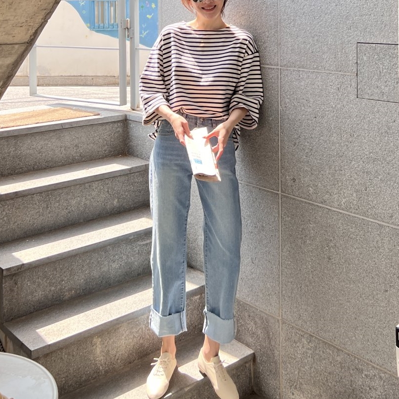롤업 와이드 연청 일자 워싱 연예인 청바지 인생 데님 팬츠