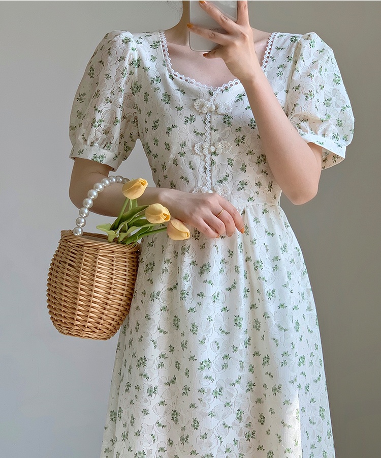 프렌치 플라워 하트넥 러블리 원피스 퍼프 반팔 소매 여름 레이스 단추 잔꽃무늬 플레어 미디 원피스 청순 여리핏 아일렛 펀칭 복고풍 로맨틱 원피스 치마 스커트 데이트룩 바캉스룩 리조트룩 여행룩