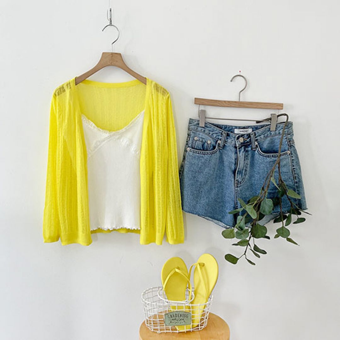여성 스카시 펀칭 형광 노랑 연두 시스루 골지 브이넥 여름 긴팔 니트가디건 흰색 민트