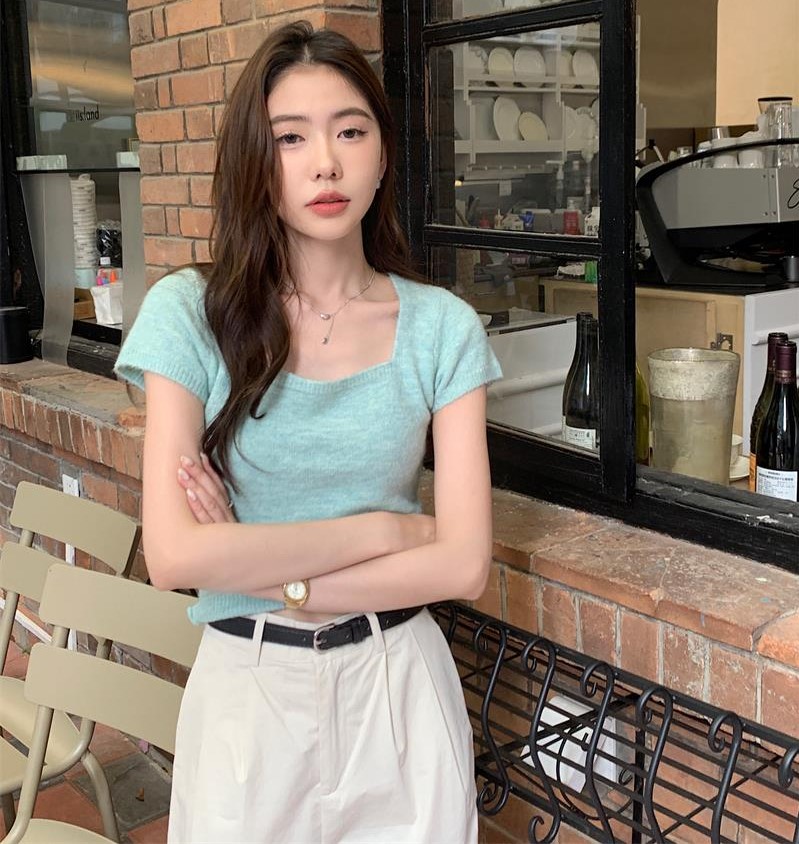 스퀘어넥 숏기장 크롭 슬림핏 반팔 니트 티셔츠 여름 캠퍼스룩 오피스룩 캐주얼 베이직 데일리룩