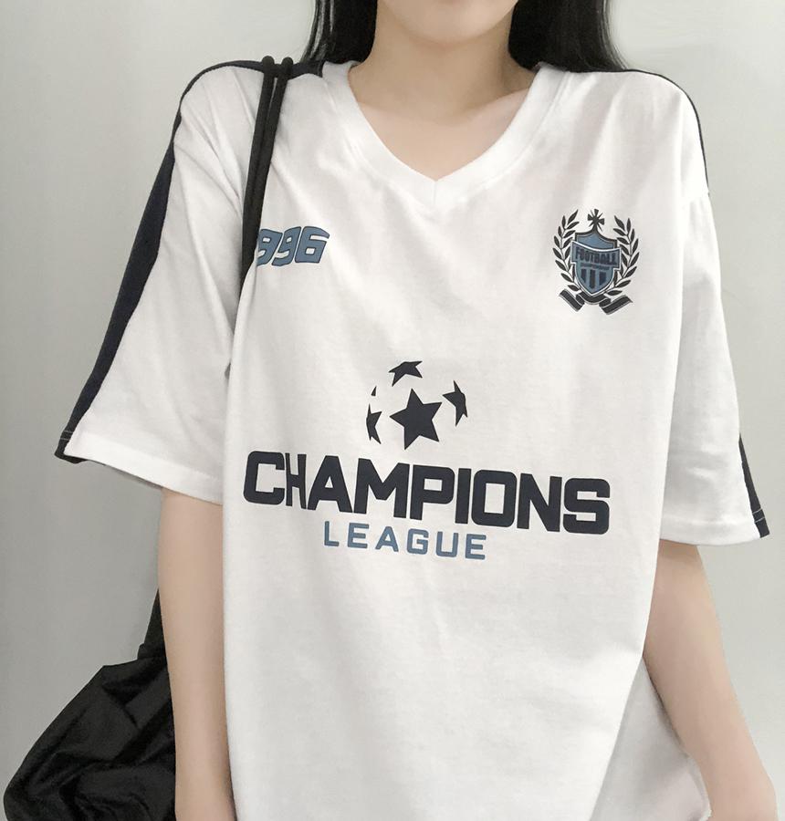 챔피언스 레터링 배색 라인 유니폼 브이넥 남녀공용 오버핏 반팔티 (2color)