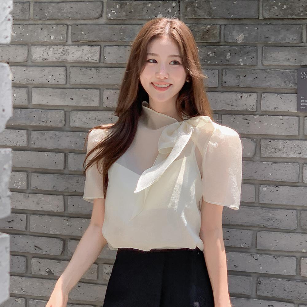 [Premium][Dali made]레이지 라운드 시스루 리본 퍼프 반팔 블라우스(하객룩/오간자블라우스)
