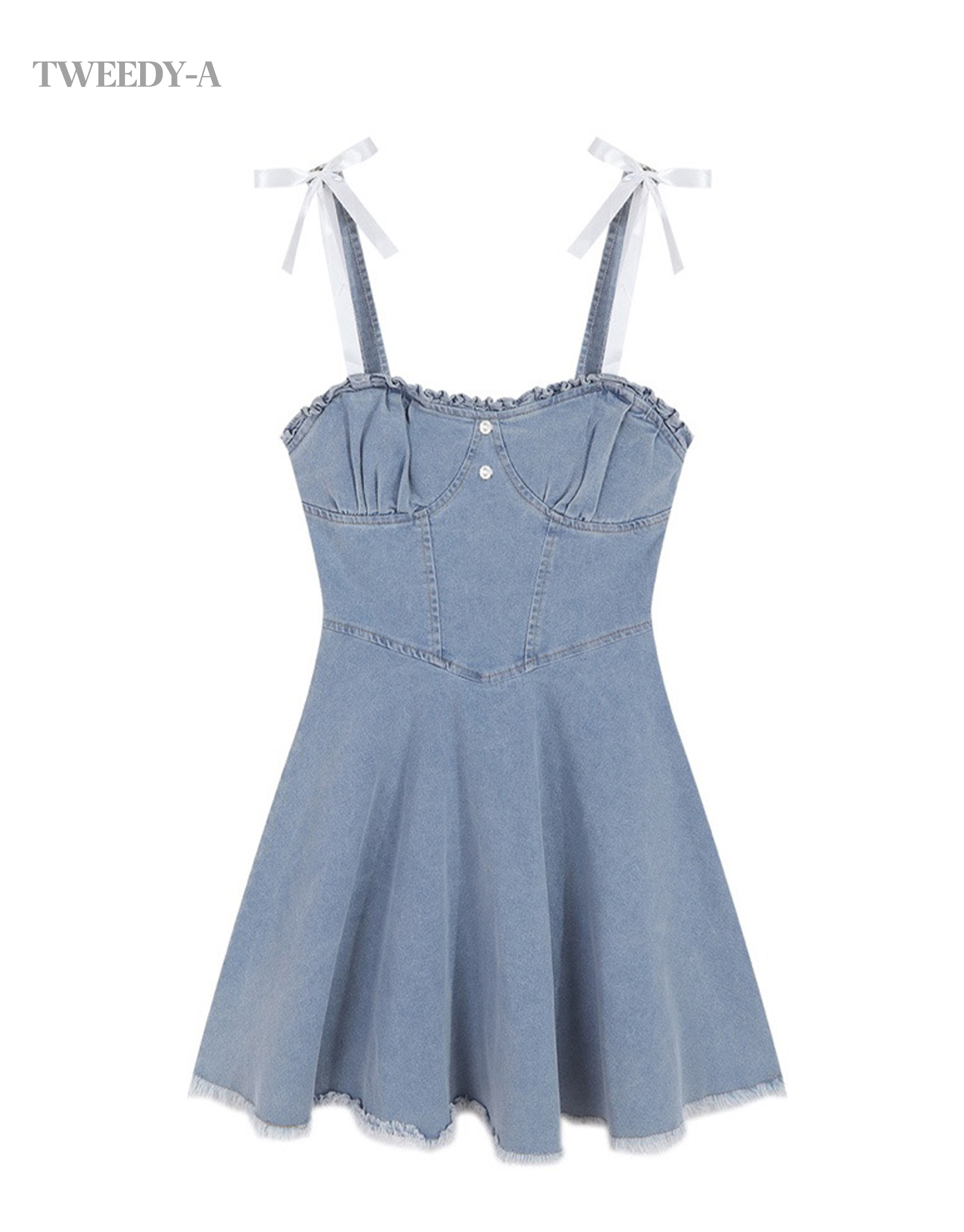(바로배송) 에덴 데님 리본 디테일 플레어 뷔스티에 미니 원피스