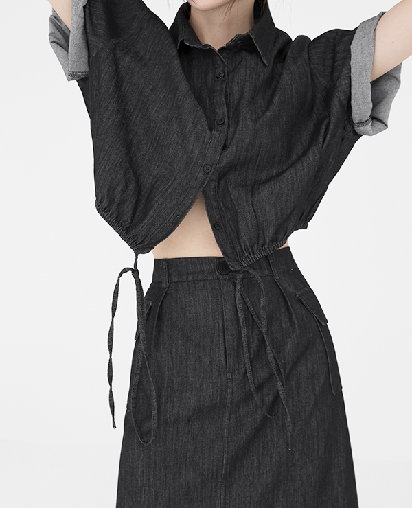 [자체제작/4천장] 케이 생지 반팔셔츠 카고 롱스커트 데님셋업 (1color)