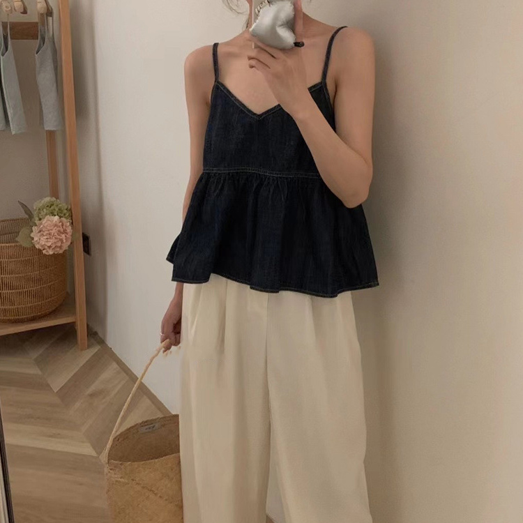 (당일출고) 브이넥 데님 진청 연청 A라인 끈조절 레이어드 조끼 베스트 나시 뷔스티에 블라우스 휴가룩 바캉스룩 휴양지룩 페스티벌룩 흠뻑쇼 2color