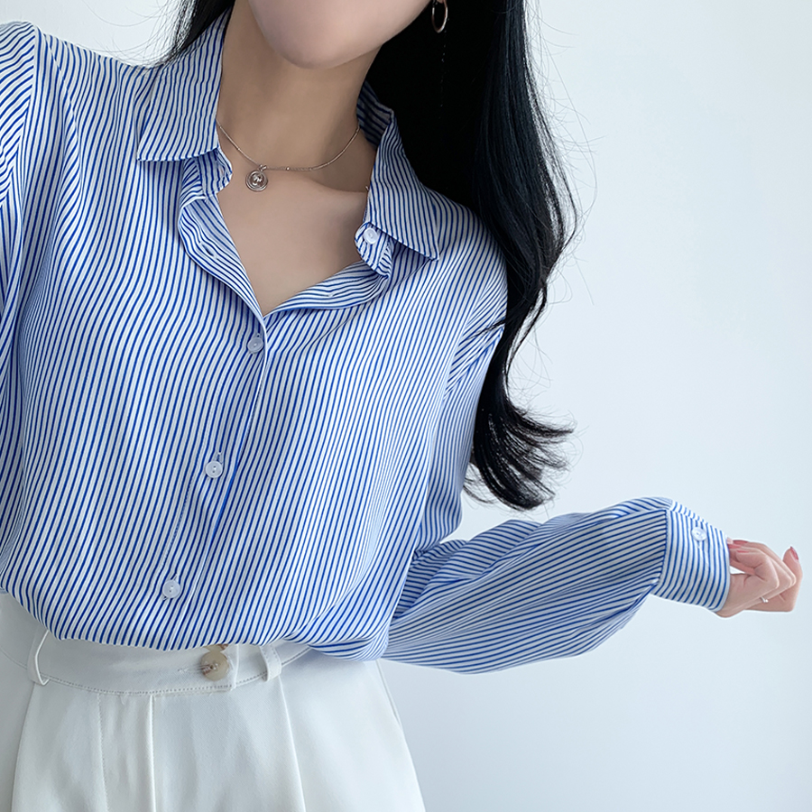 [레이온 100% 실키하고 얇은원단] 데일리 스트라이프 레이온 블라우스 P0007817