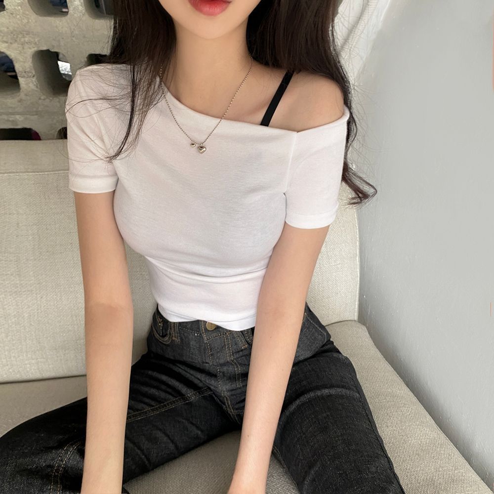 [라인예뻐/쫀쫀한] 반오프숄더 슬림 라인 쫀쫀 스판 오프숄더티셔츠 여름 오프숄더 반팔티셔츠