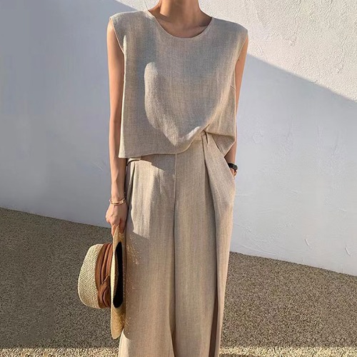 심플 내추럴 우아한 린넨 나시 탑 + 주름 와이드 팬츠 투웨이 세트 634675