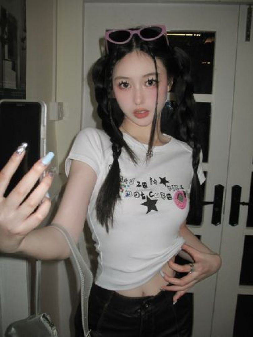 여자 흰티 크롭탑 라운드 슬림핏 타이트 쫄티 크롭티 반팔쫄티 별 프린트 숏 반팔티 화이트