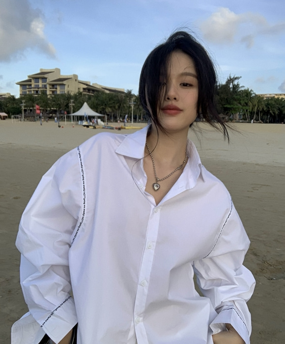 중간 길이 흰색 셔츠 카라깔끔한 면접 스타일링 와이드 투단추 여성스러운 일상 데일리 스티치 레터링 있는 포인트 의상 긴팔 디자인 탑 상의 일상복 데일리룩 스트릿 패션