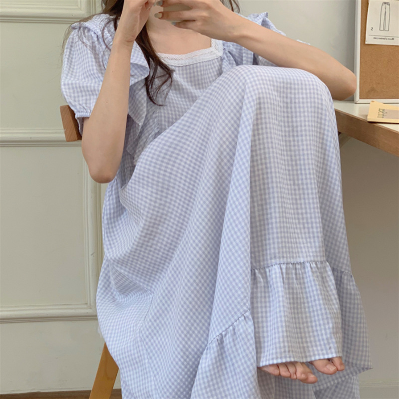 프릴 체크 스퀘어넥 원피스 잠옷 여름 반팔 롱원피스 파자마 파티 블루