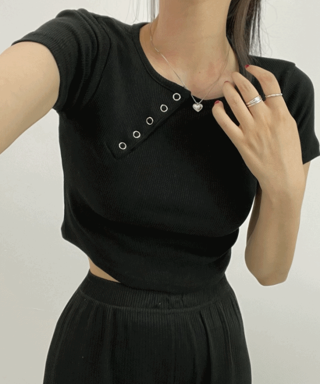 사선 또또 단추 💕 버튼 크롭 골지 슬림 반팔 티셔츠 5color