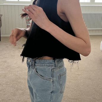 [당일] neuadult 노이어덜트 자가드 플레어 나시탑 블랙 플레어 어깨 리본끈 크롭 뷔스티에