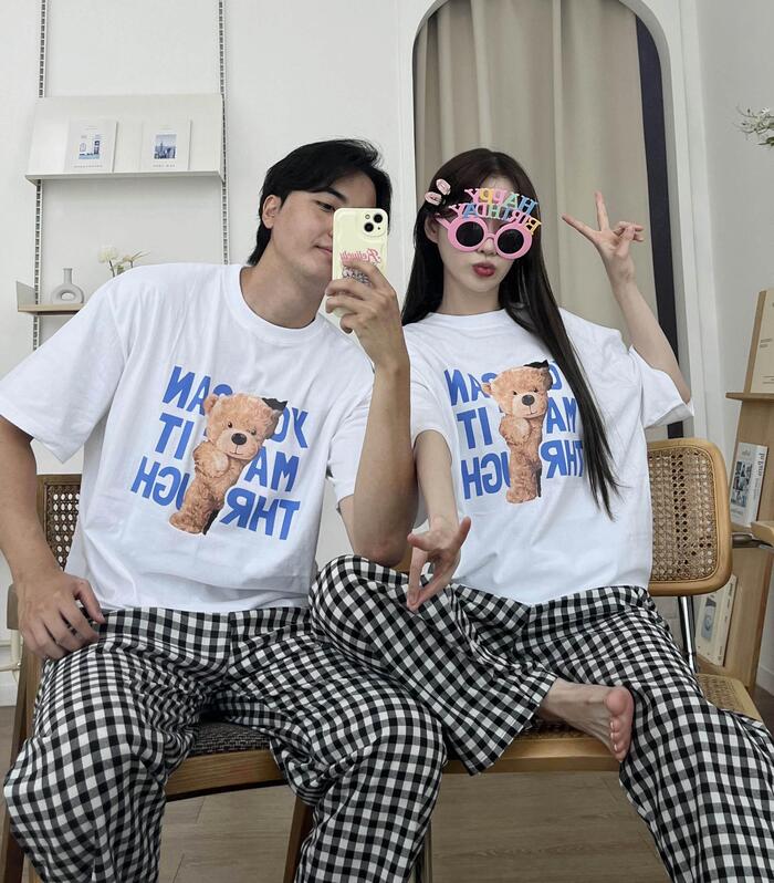 *초특가[세트가능/귀여움보장] 남녀공용 여름 반팔 곰돌이 오버핏 티셔츠 빅사이즈 꾸안꾸 데일리 파자마 잠옷 체크팬츠 커플룩 시밀러룩 선물 신혼 여행 마실룩 데이트룩