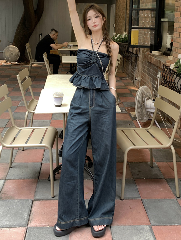 클럽/스트릿 발리 나시크롭 셔링 홀터넥 튜브탑 + 풀와이드 하이웨스트 데님 팬츠
