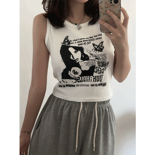 프린팅 골지 민소매 나시 2color