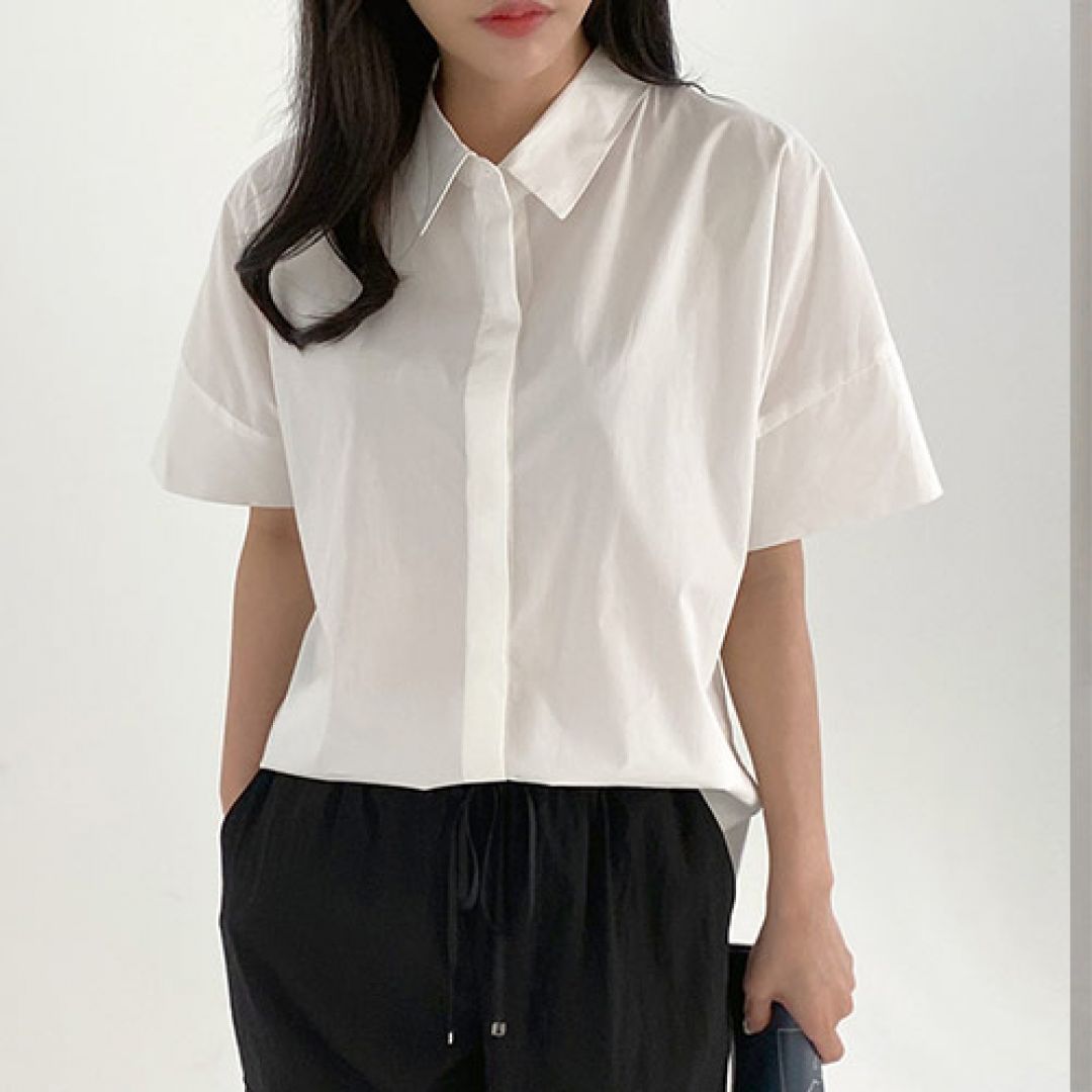 여자 30 40대 미시 무지 흰셔츠 카라 나그랑 뒤 핀턱 주름 a라인 반팔 남방 블라우스