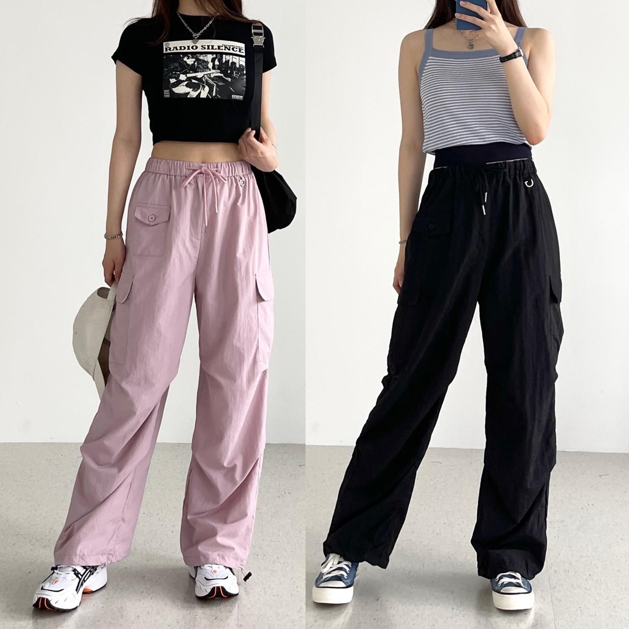바스락 조거팬츠 나일론 우븐 여름 여성 핑크 카고조거팬츠 여자냉장고바지 스트링 와이드 쿨