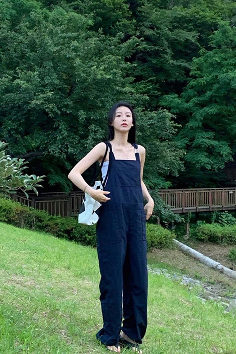 심플 슬림 카고 메탈 버클조정 민소매 멜빵바지 와이드 통바지