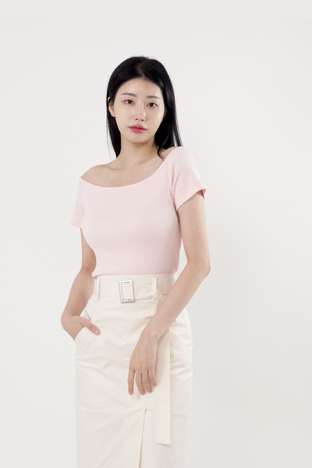 당일발송>오프숄더 골지 슬림 티셔츠_ 핑크 Off-shoulder ribbed slim T-shirt_PINK