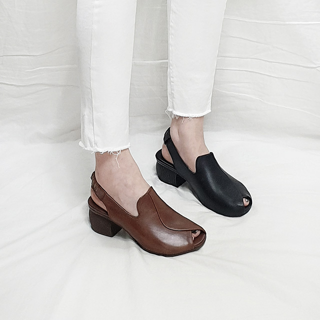 엘랑 오픈토 소가죽 튤립라인 밴딩 키높이 통굽 슬링백 6cm