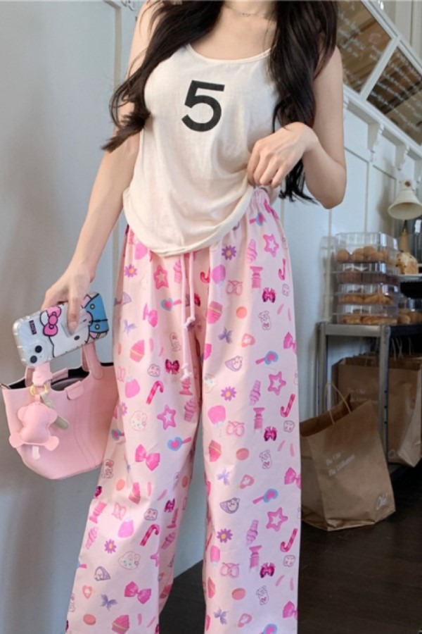 set 숫자 5 민소매 나시 탑 내방 소품 프린팅 캐주얼 팬츠 투피스 세트