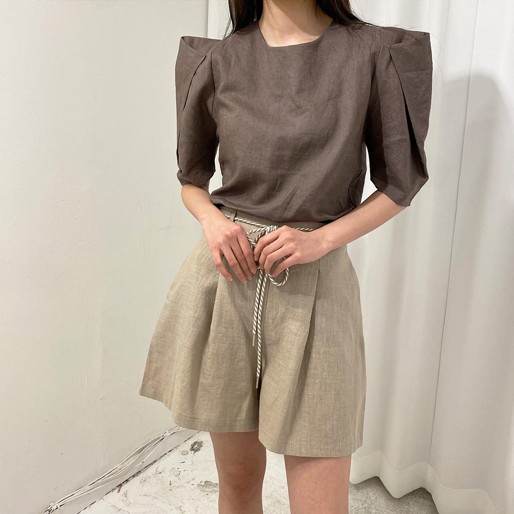 어좁이 어깨커버 퍼브소매 린넨 마 반팔 라운드 넥 뒷트임 버튼 여름 블라우스