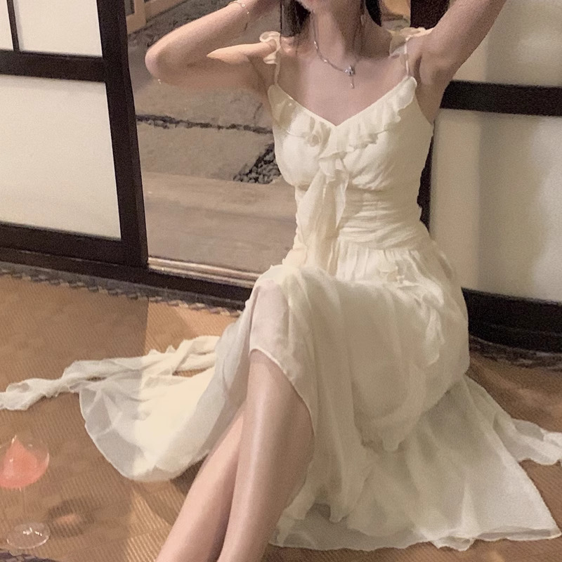 해외촬영 캉캉 쉬폰 화이트 휴가지 끈나시 원피스