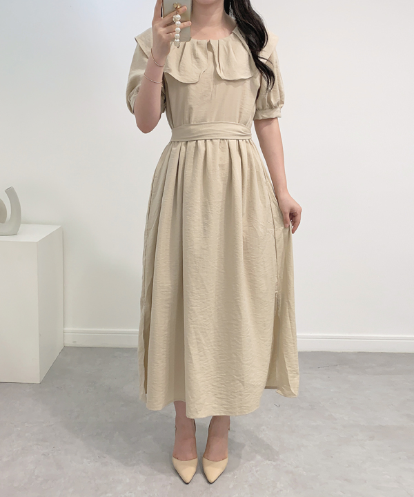리즈 여름 프릴 벨트 셔링 반팔 빅카라 롱 원피스