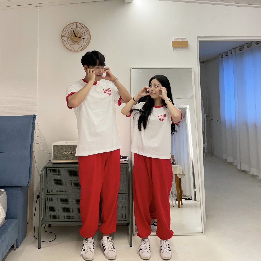[커플강추👍] 여름 남여공용 배색 크롭 오버핏 러빗 반팔티 조거팬츠 브루마 커플 시밀러룩