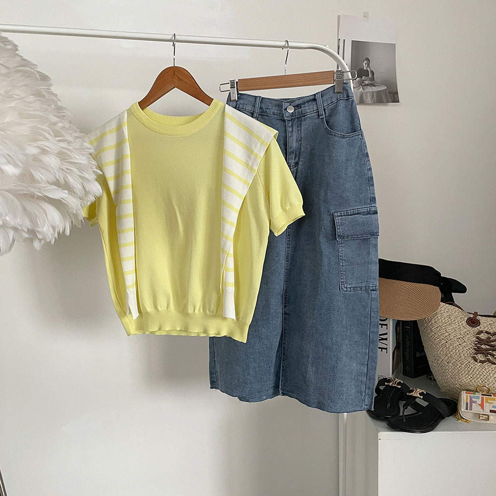 단가라 숄 심플 반팔 니트 세트 깔끔한 여름니트 코디룩 페미닌한 무지니트