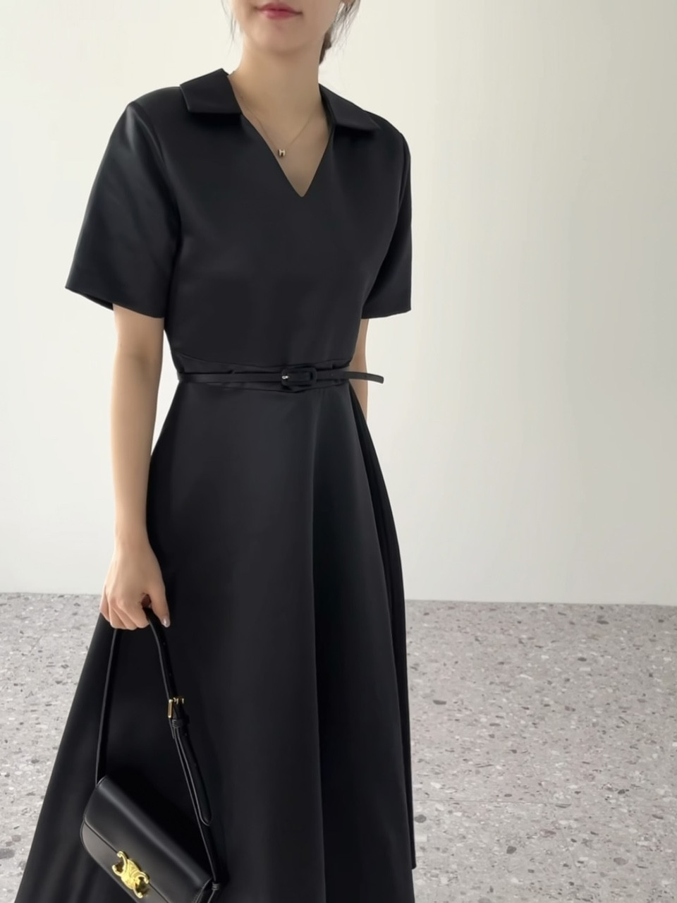 (자체제작)다이아 새틴 카라 브이넥 벨트세트 파티룩 고급 돌잔치 결혼식 하객원피스 롱원피스 블랙