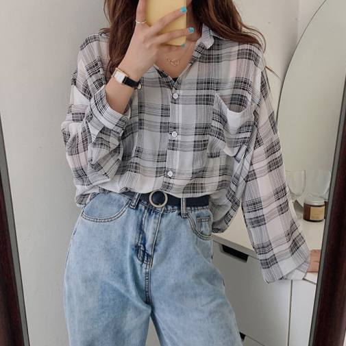 여리 쉬폰 시스루 오버핏 긴팔 체크 남방 셔츠 블라우스
