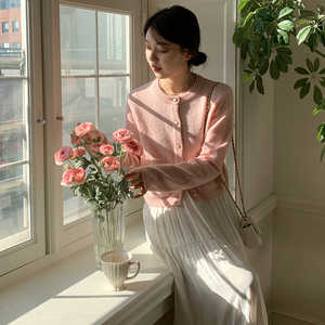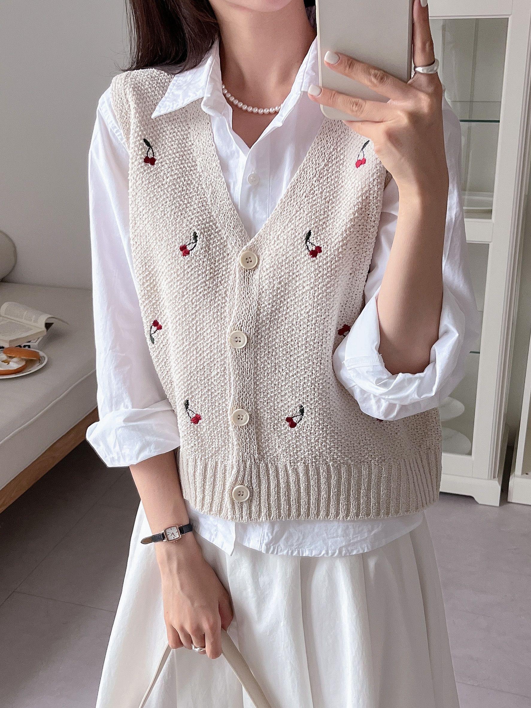 체리 자수 오픈 단추 크롭 여성 니트 조끼 베스트