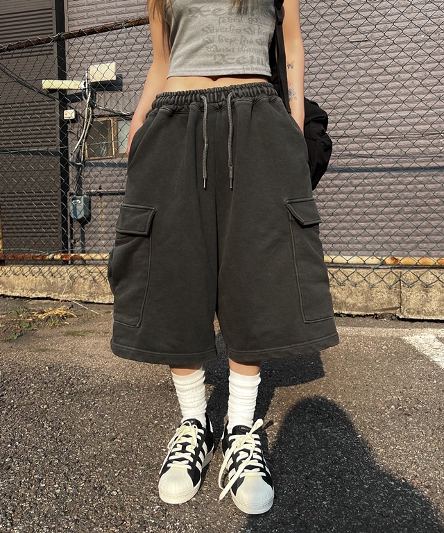 (UNISEX) 메테 피그먼트 카고 버뮤다 PT / 코튼 면 밴딩 트레이닝 와이드 팬츠 반바지 바지 버뮤다팬츠 버뮤다바지 5부바지 7부바지 6부바지 카고반바지 유니크 빈티지 y2k