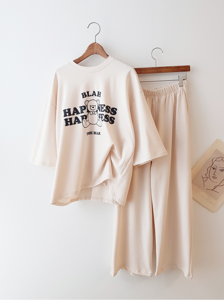 HAPPINESS BEAR SET/ 귀여운 곰돌이 베어 프린트 루즈핏 티셔츠 밴딩 와이드팬츠 통바지 데일리 홈웨어 잠옷 파자마 트레이닝복 추리닝 세트