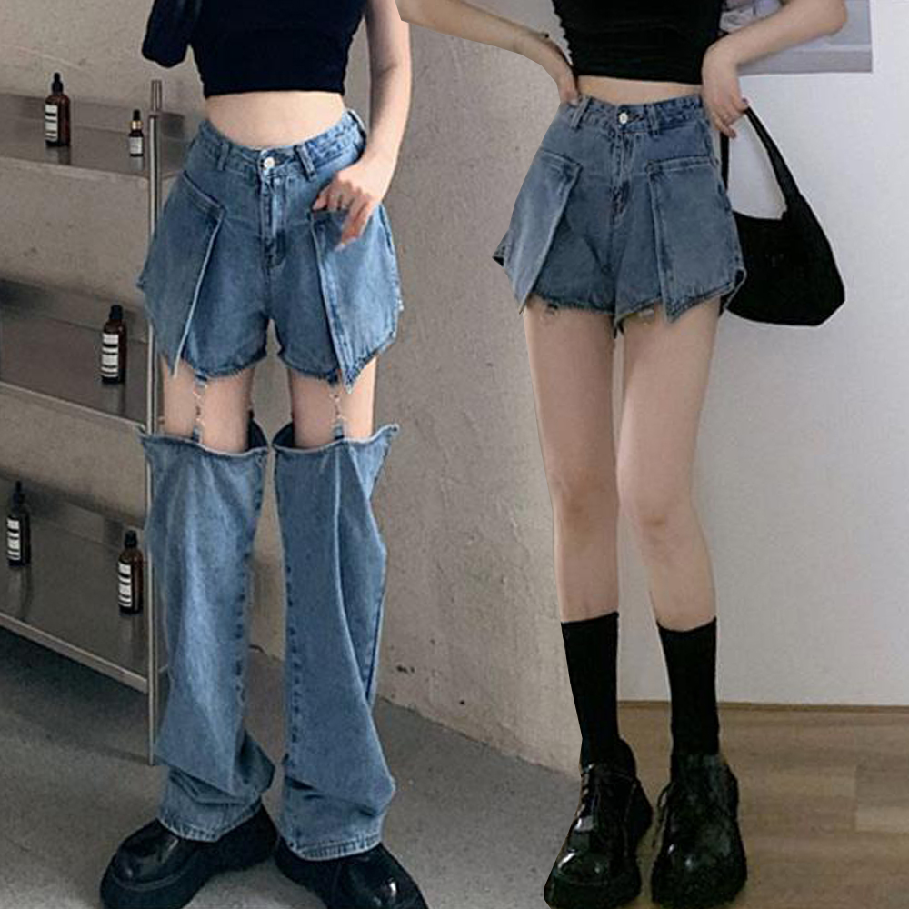 탈부착 데님 반바지 긴바지 청바지 와이드핏 휴가룩 독특한 대학생룩