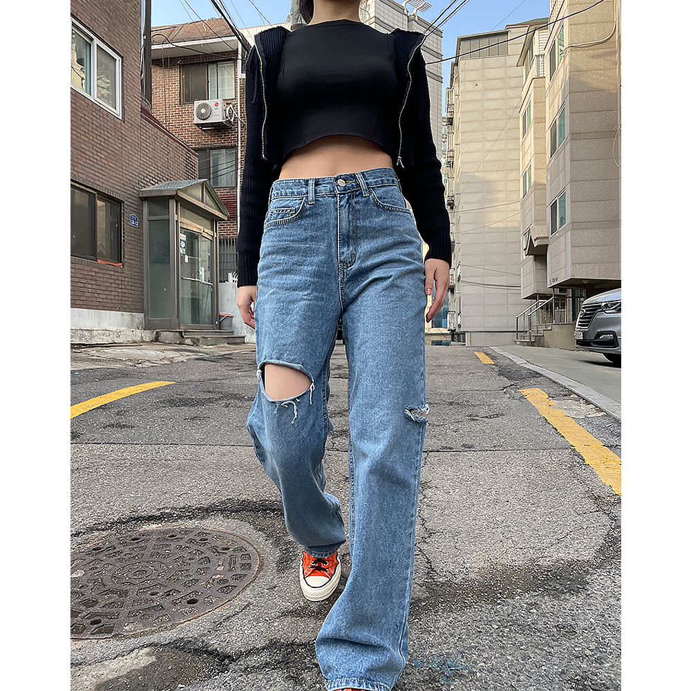 찢청 찢어진 청바지 와이드 하이웨스트 중청바지