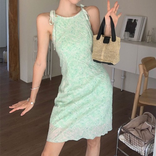 민트그린 플로럴 플라워패턴 텍스처 민소매 슬림 원피스 15848