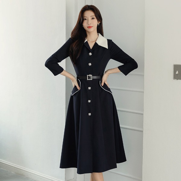 도웰브 플랫 카라 스퀘어 진주 버튼 주얼 벨트 셋트 플레어 원피스