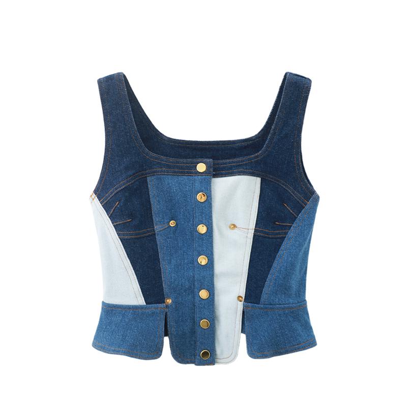 데님 배색 청청패션 조끼 베스트 티셔츠 크롭 탑
