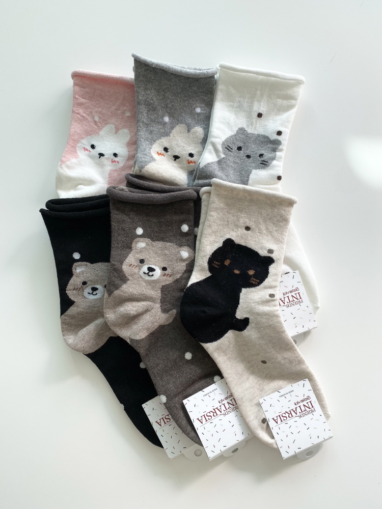 [인따르시아] 발목조임없는 돌돌이 무압박 편안한 장목양말 고양이 곰돌이 동물양말