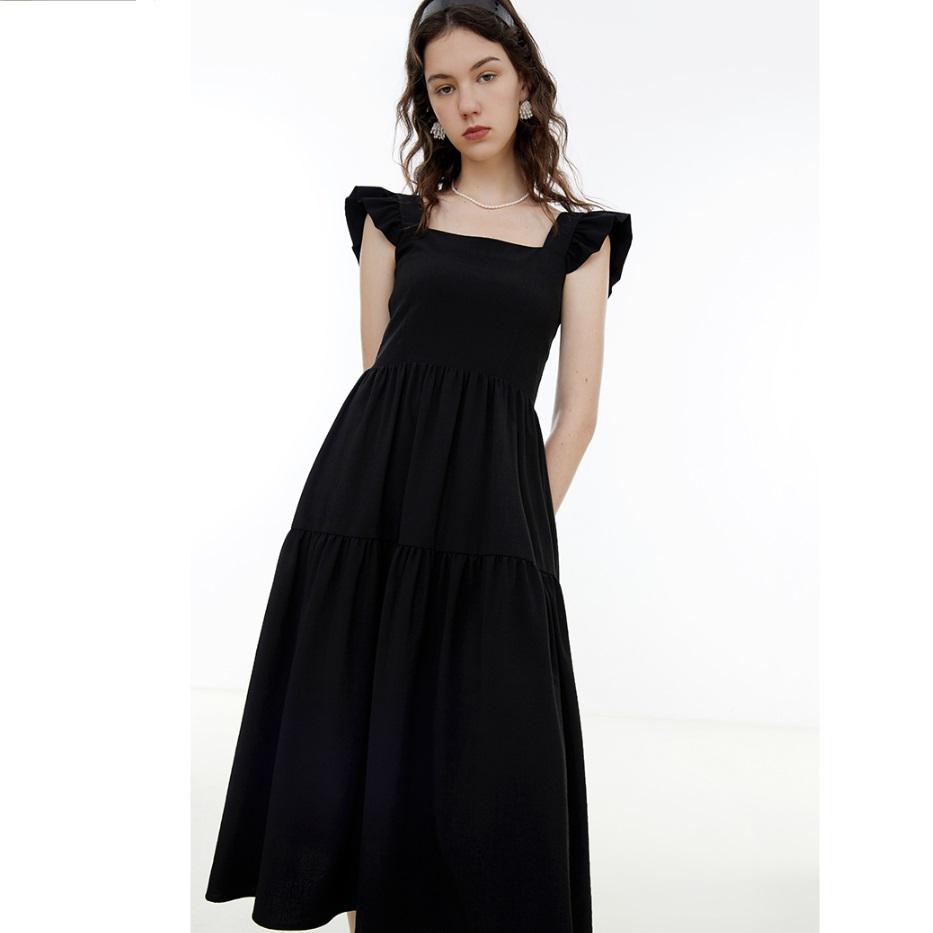 햅번 캡소매 블랙 플레어 스퀘어넥 원피스 백리스 결혼식 하객룩 등하원룩