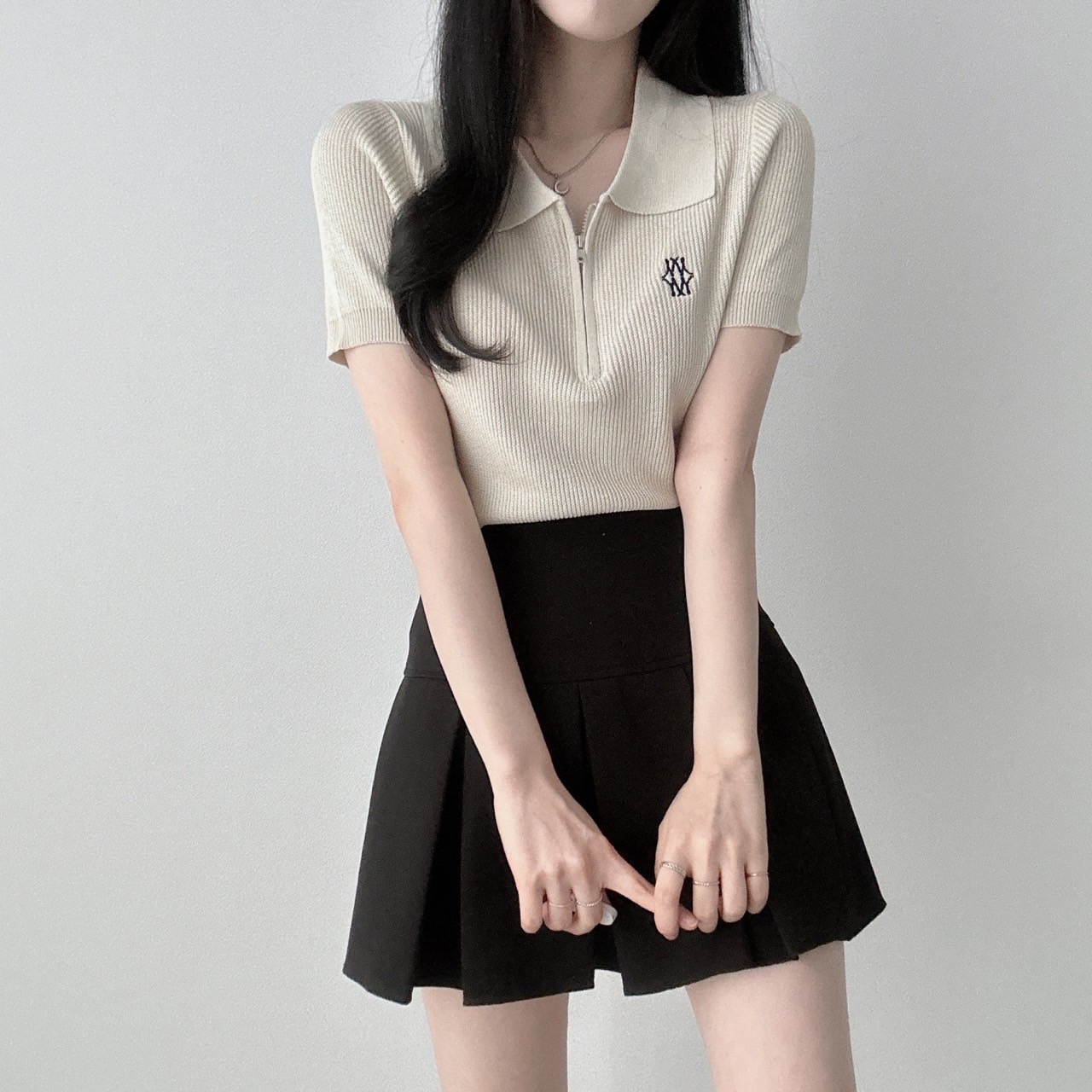 [깔끔룩/캐주얼룩/반집업/여름니트/골지니트]자수 반집업 카라 크롭 니트 5color