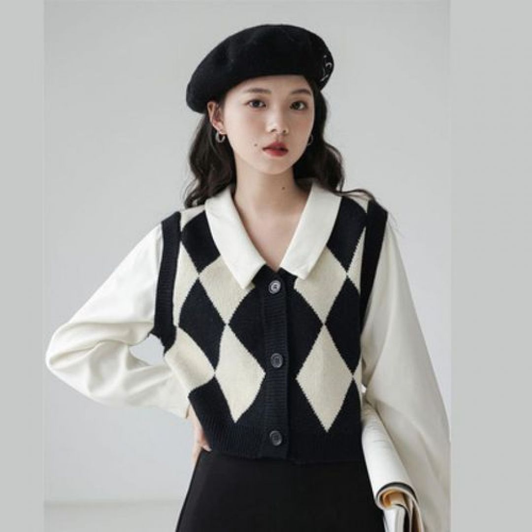 크롭 다이아 체크 브이넥 카라 단추 니즈 조끼 배색 레이어드 셔츠 블라우스 가을신상 그린